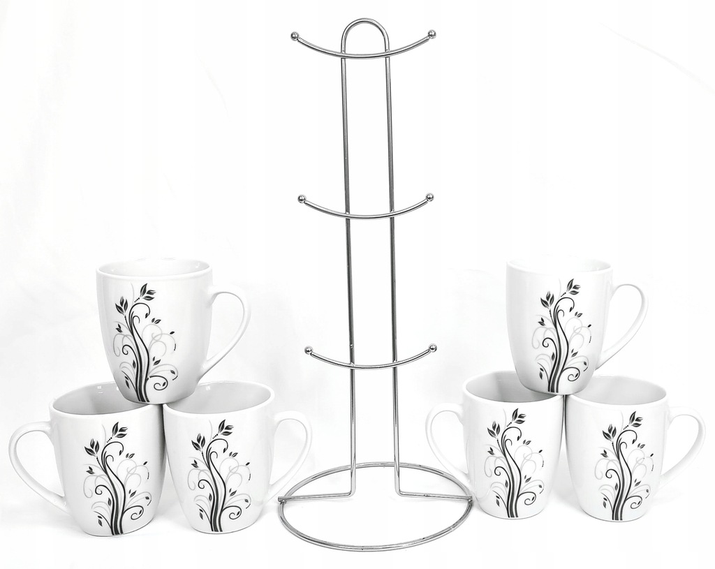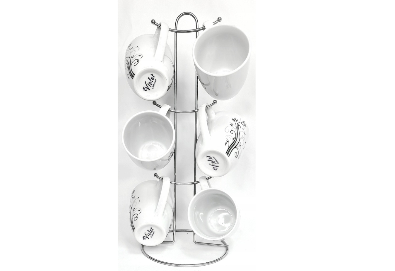Komplekts paredzēts karsto un auksto dzērienu pasniegšanai. Metāla statīvs paredzēts ērtai krūzīšu uzglabāšanai un žāvēšanai.