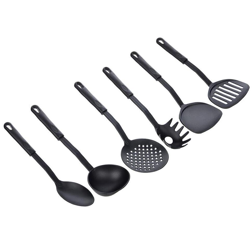 Šis 6 daļu virtuves piederumu komplekts ir lielisks sākuma komplekts jaunai virtuvei vai praktisks papildinājums esošajai. Izgatavoti no izturīgas melnas plastmasas, šie instrumenti ir viegli, ērti un, galvenais, droši jūsu katliem un pannām, jo tie neskrāpē teflona vai keramikas virsmas.